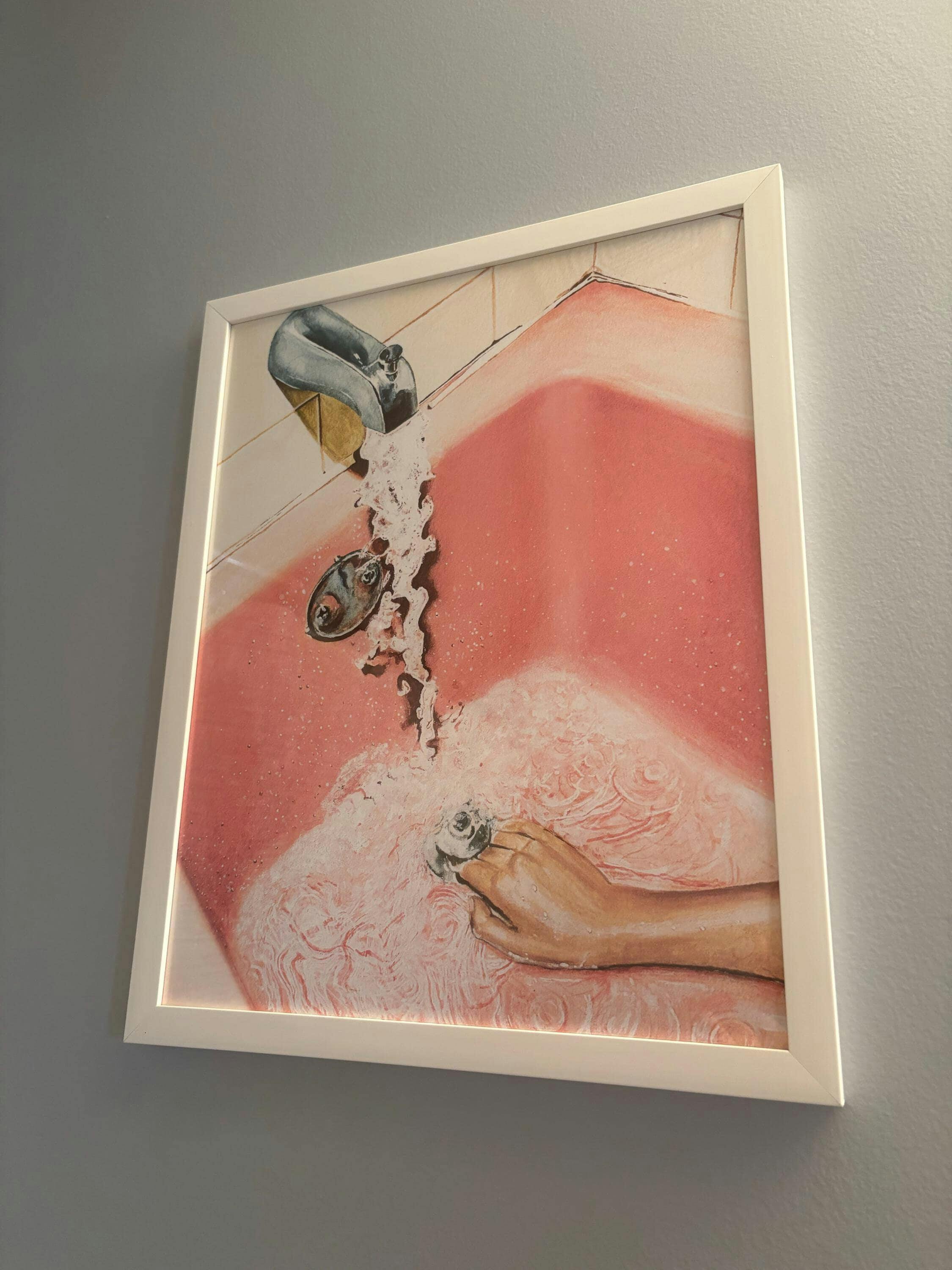 This feminine, pink bathroom print has different meanings depending on the viewer's perspective. Is it a relaxing scene in a retro 50's bath or does it contain underlying sexual symbolism? This is painted replica of an original photograph by Taylor Radelia.