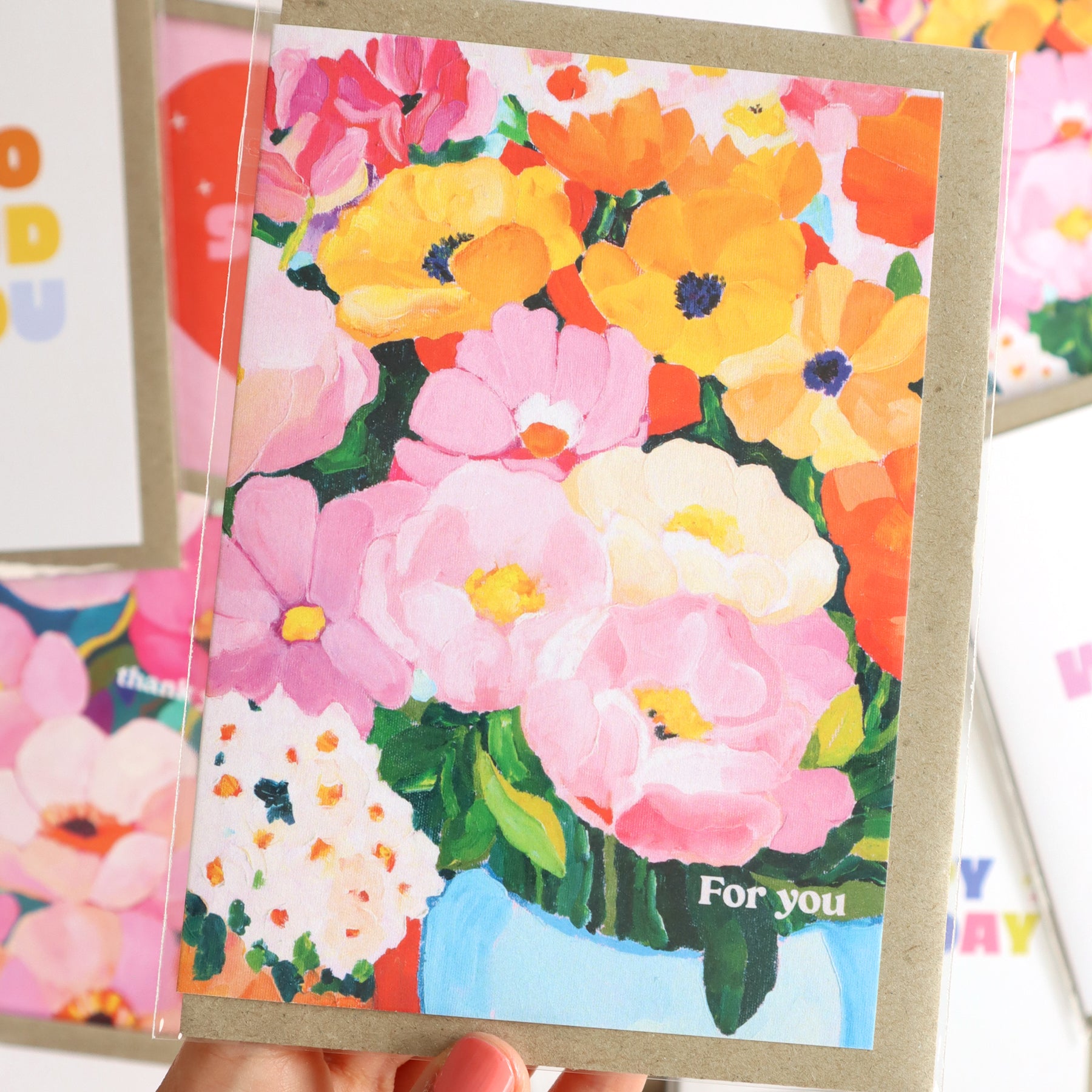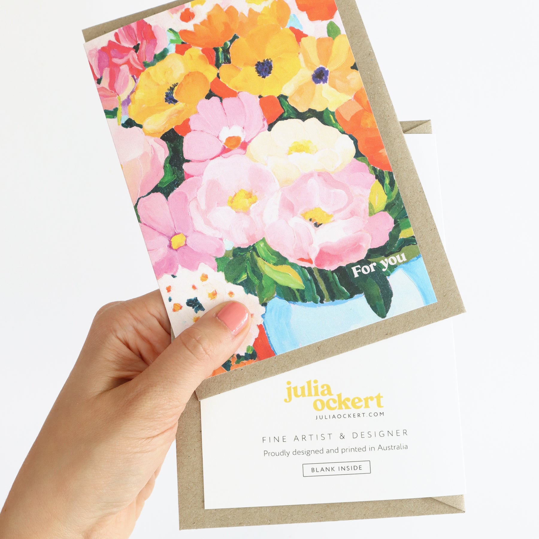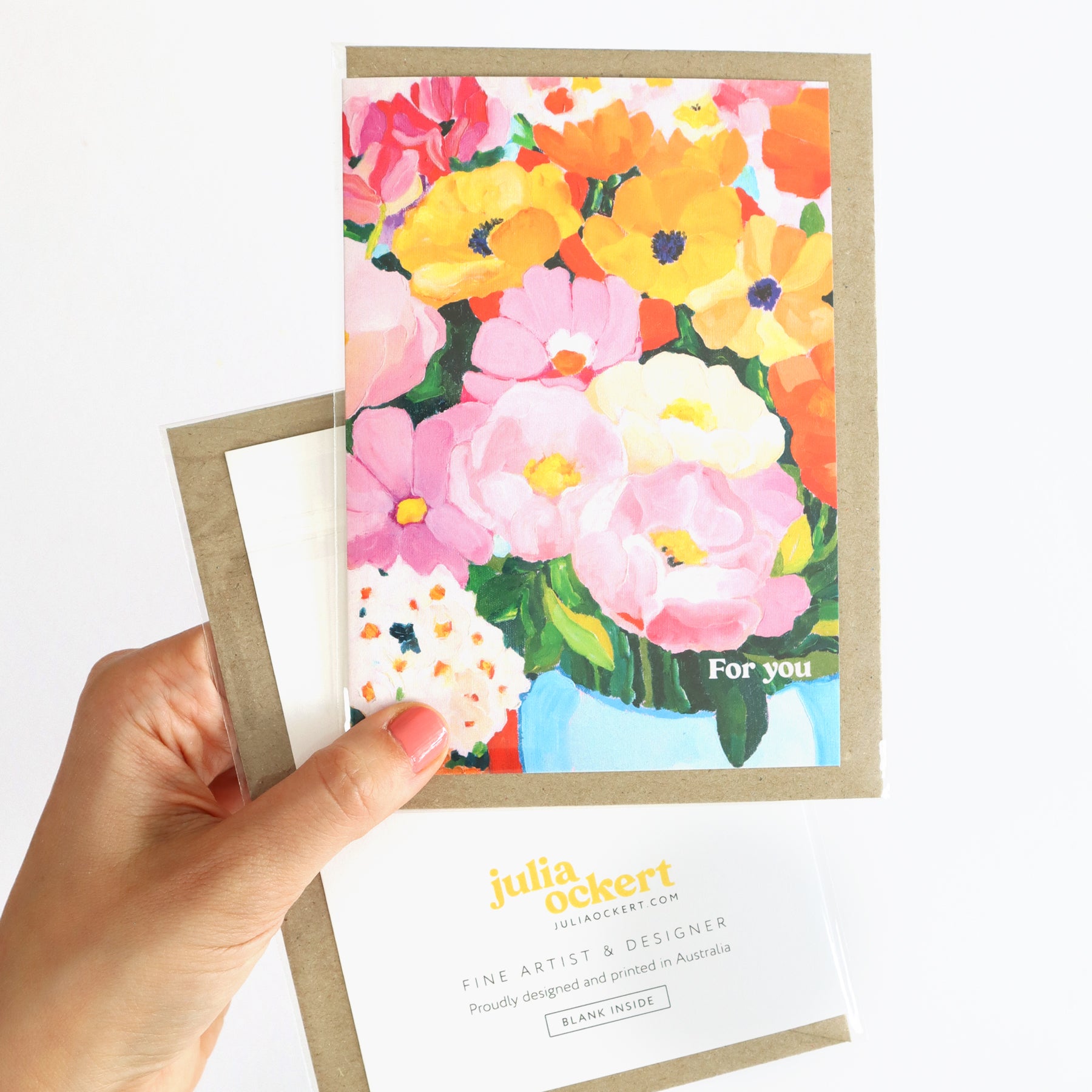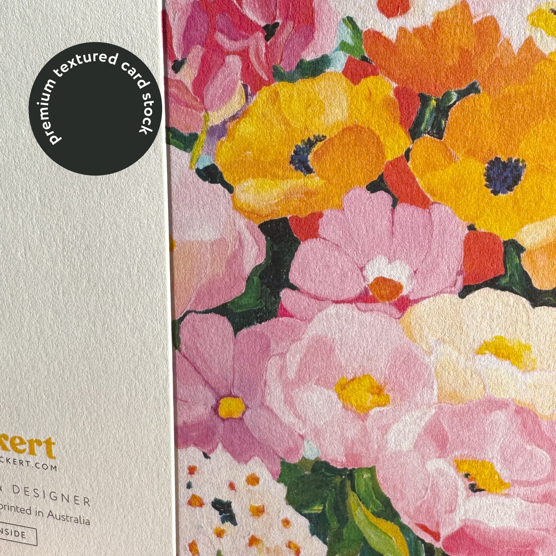 This vibrant, floral card is perfect for celebrating any occasion - Birthdays, Engagements, Graduations, Anniversaries, Retirements! This "Market Flowers" artwork was painted and designed by me and printed in Australia.