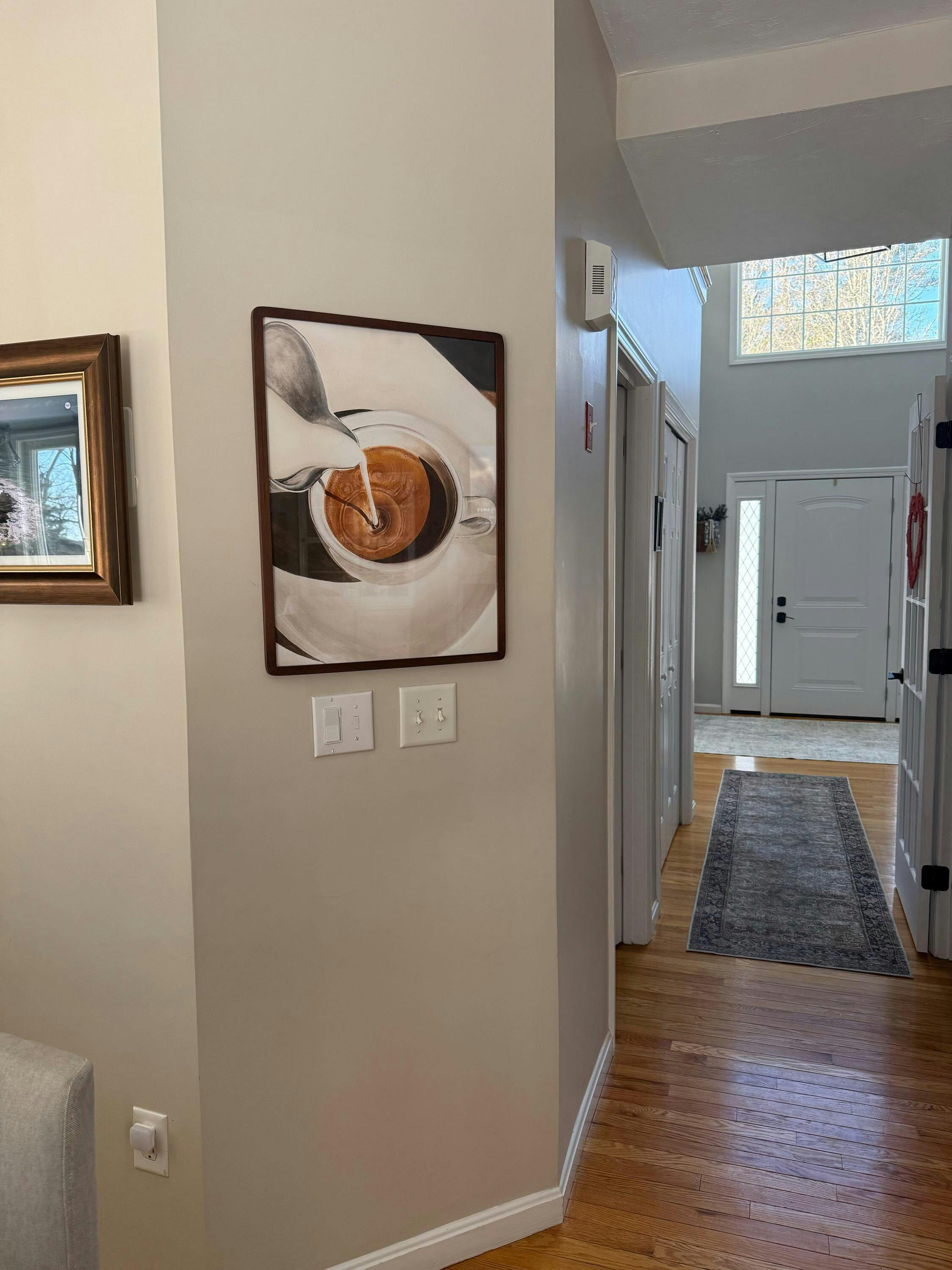 The piece is gorgeous. It's such high quality printing; it looks like the original painting behind glass. She also shared a sweet note! Absolutely love it and I think it looks so cute over my coffee machine. Julia is insanely talented!!