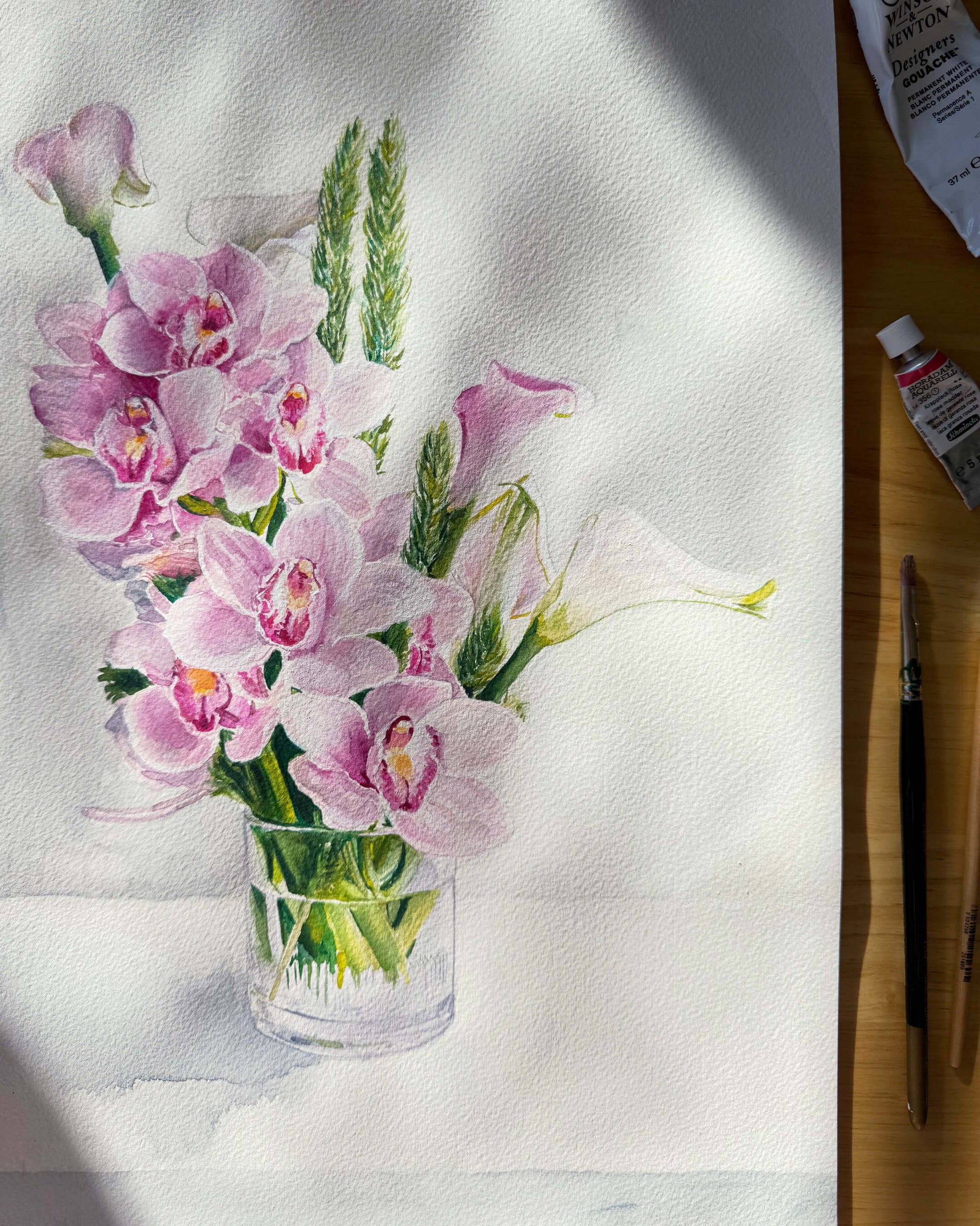 Introducing this striking, yet soft floral still life painting. This is one of the first detailed watercolour paintings I've done in quite a while, featuring Pink Cymbidium Orchids and Calla Lilies. There is a lovely contrast between warm and cool tones, as well as loose and detailed watercolour techniques in this artwork. Painted on textured cotton rag paper with professional watercolour paints.