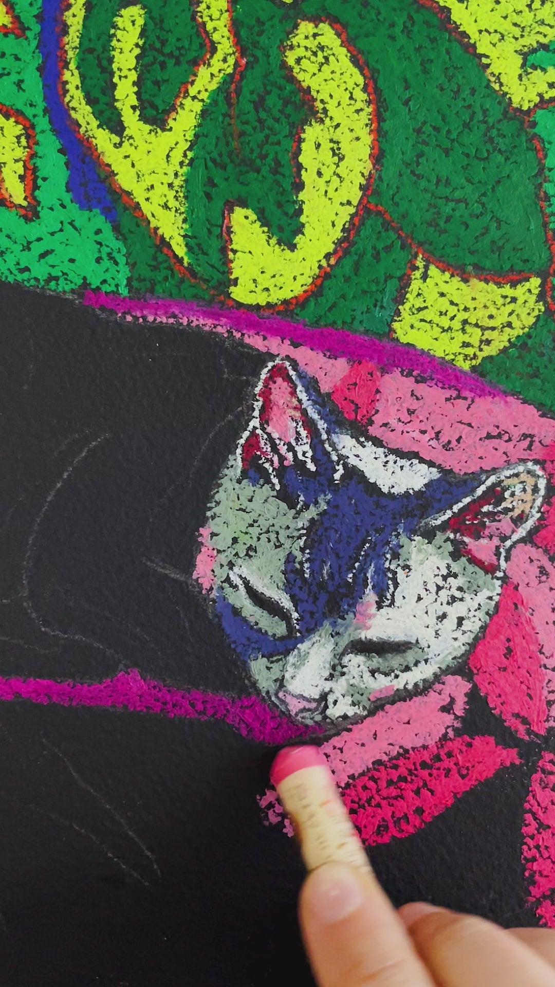 Inspired by Matisse, this playful artwork features a sweet tabby cat who is based on my cat Dusty! The use of complimentary colours through this oil pastel drawings makes it a feast for the eyes, while the subject matter gives a sense of calm and serenity. The black background peeks through the oil pastels and adds depth texture.
