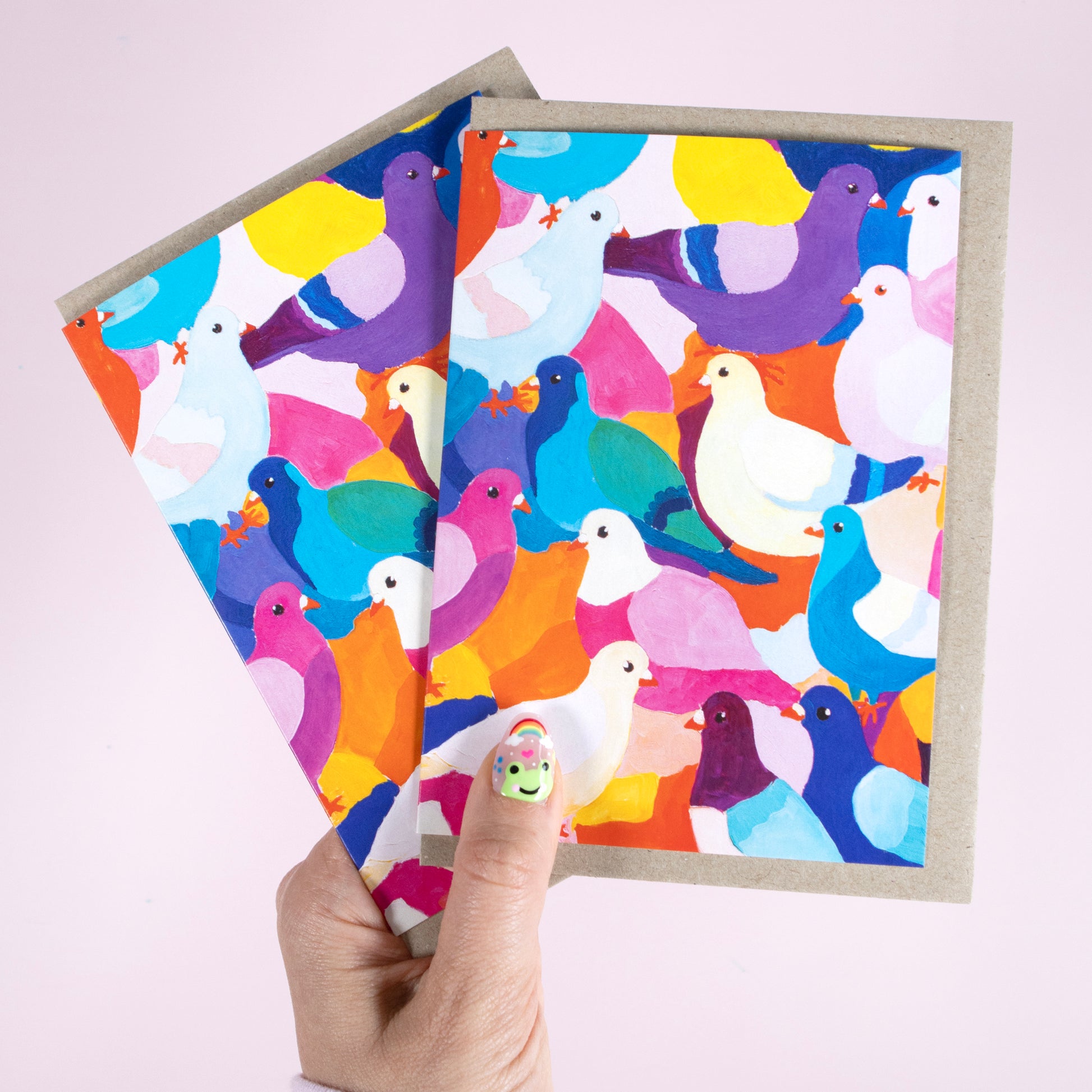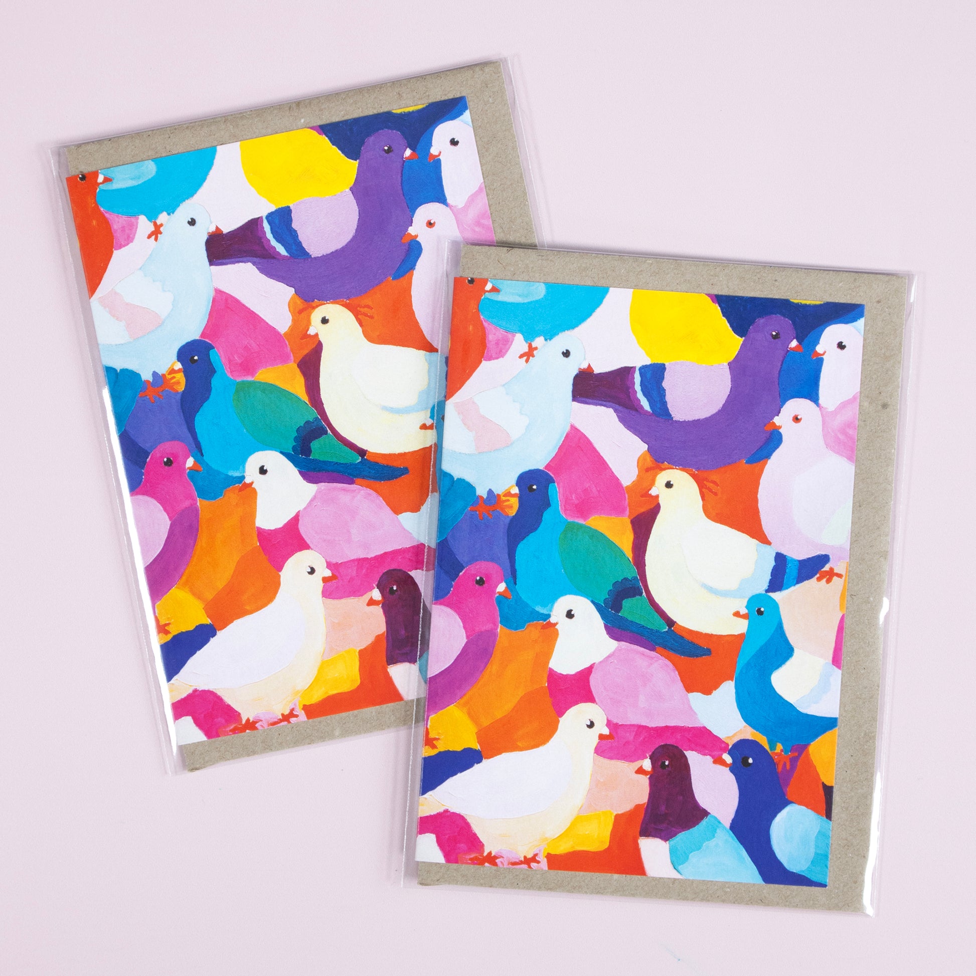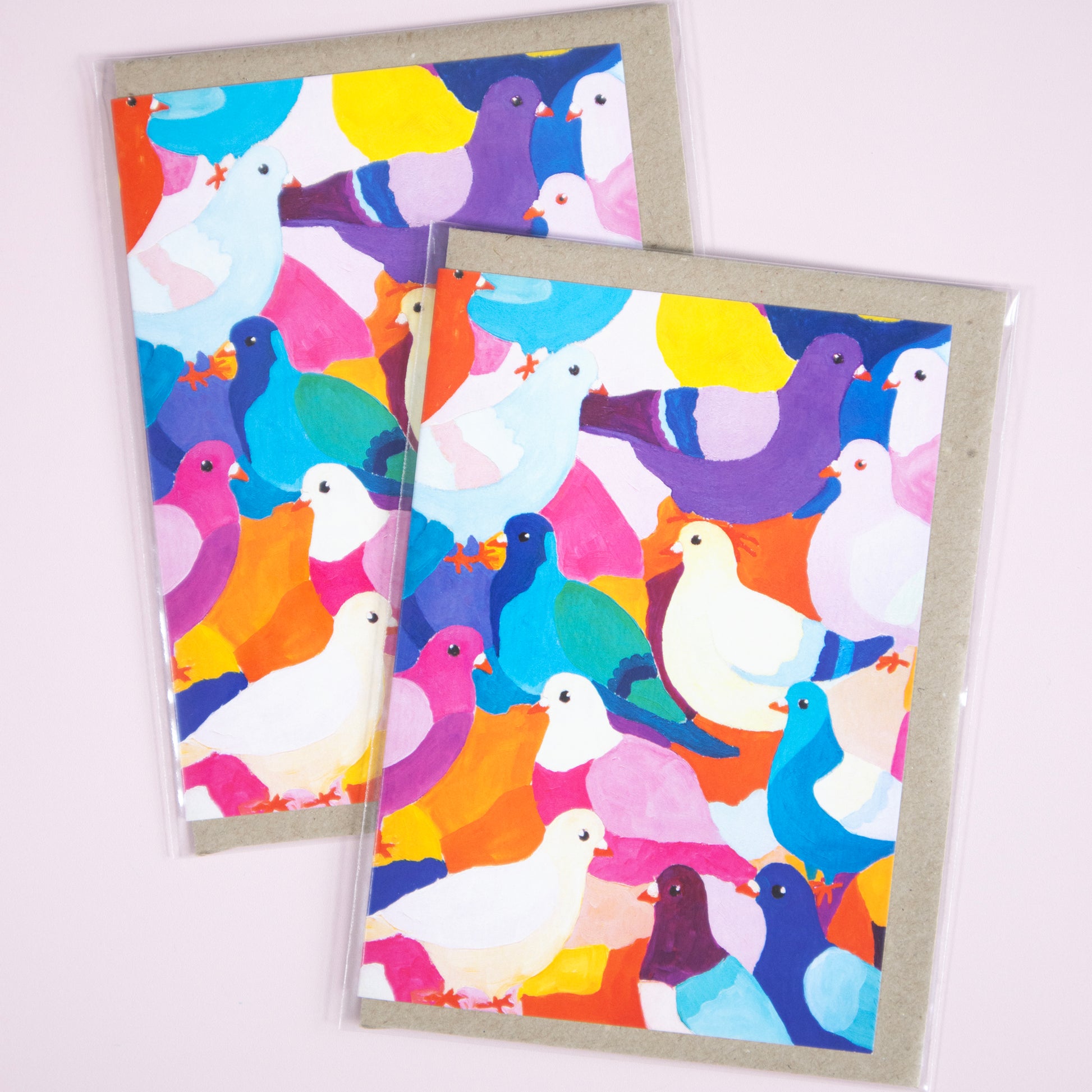A card with my original oil pastel artwork of colourful, happy pigeons!! Perfect for any occasion needing a marvellous pop of colour and celebration - be it a birthday, thank you note, or just a way to say hello! The playful design makes it stand out and is sure to spark joy.