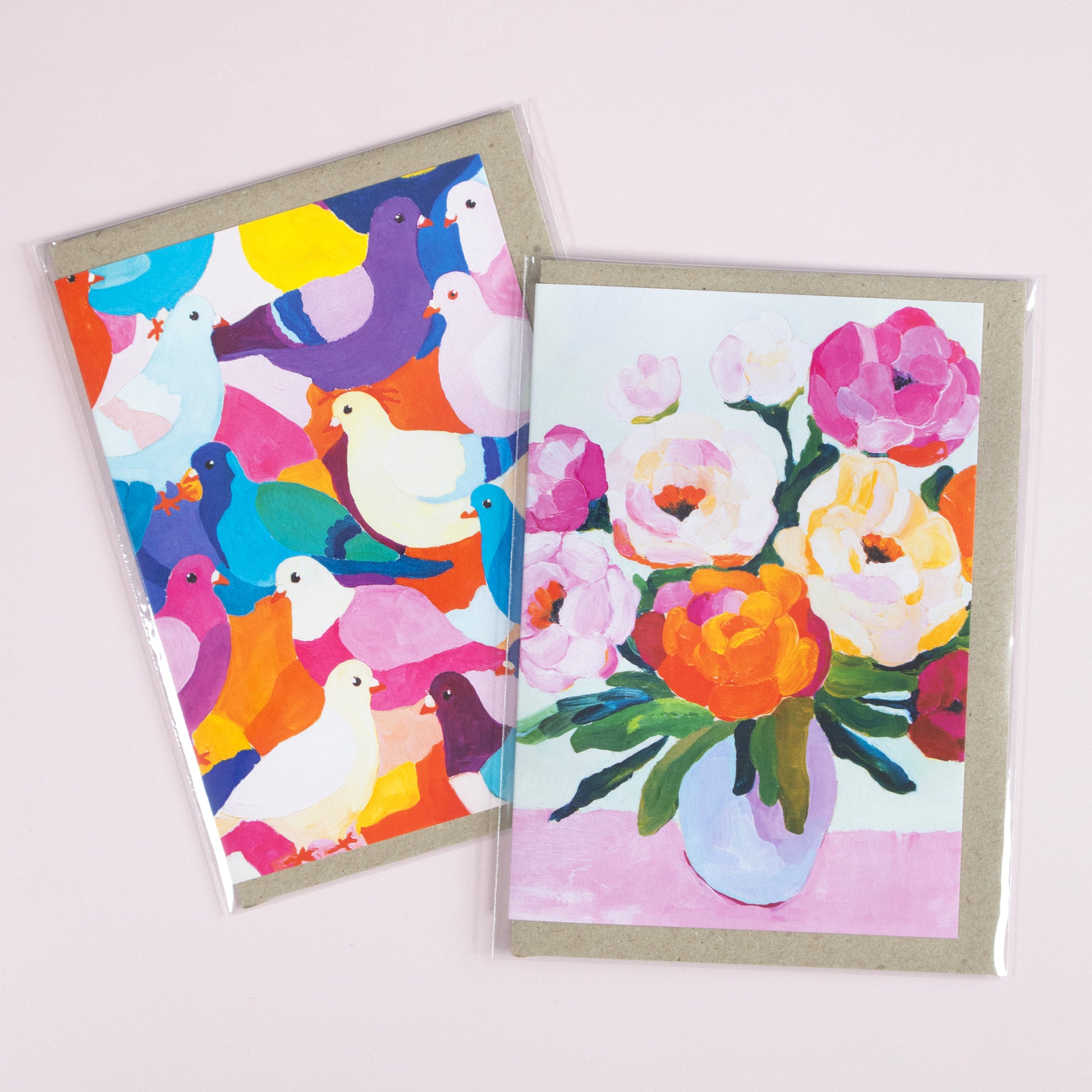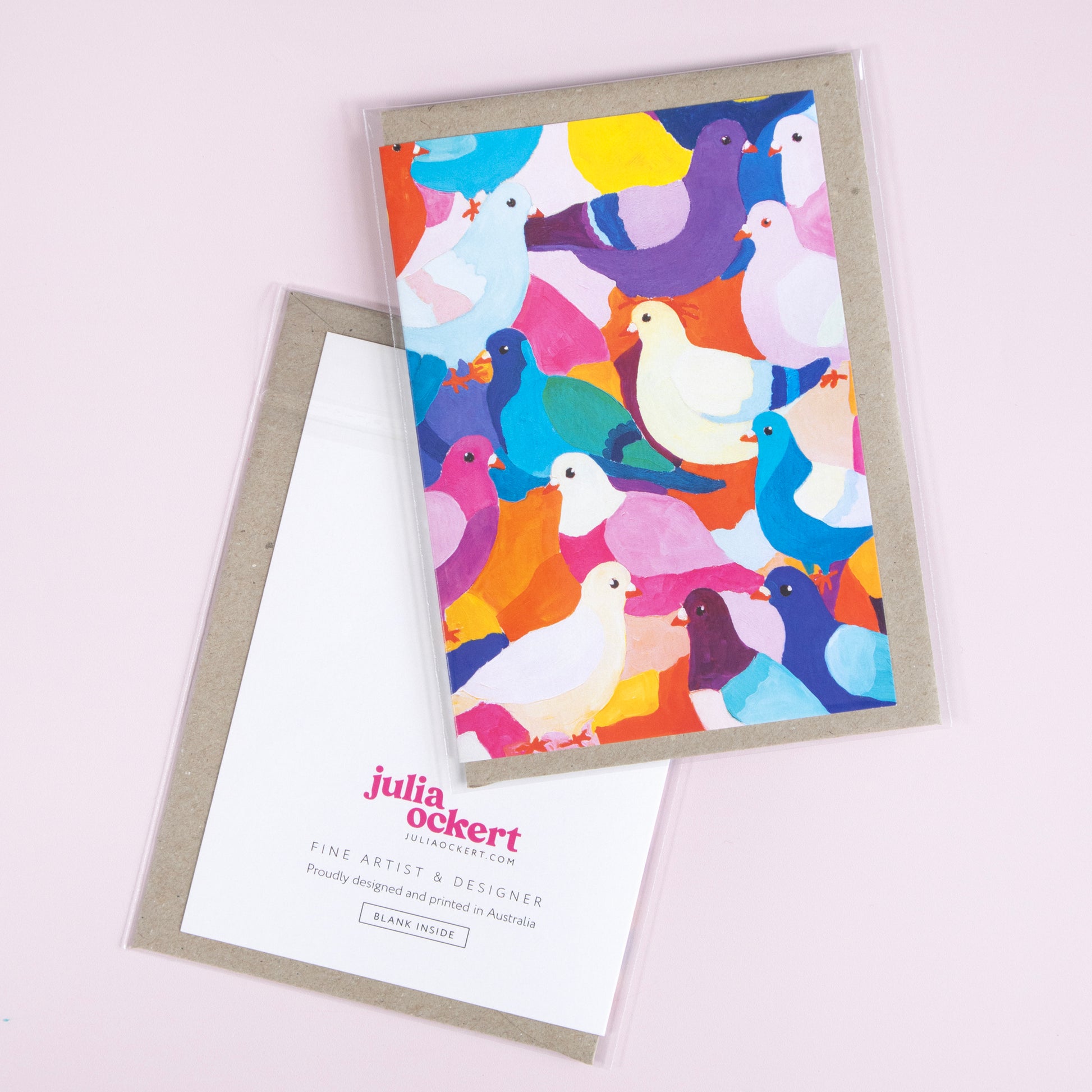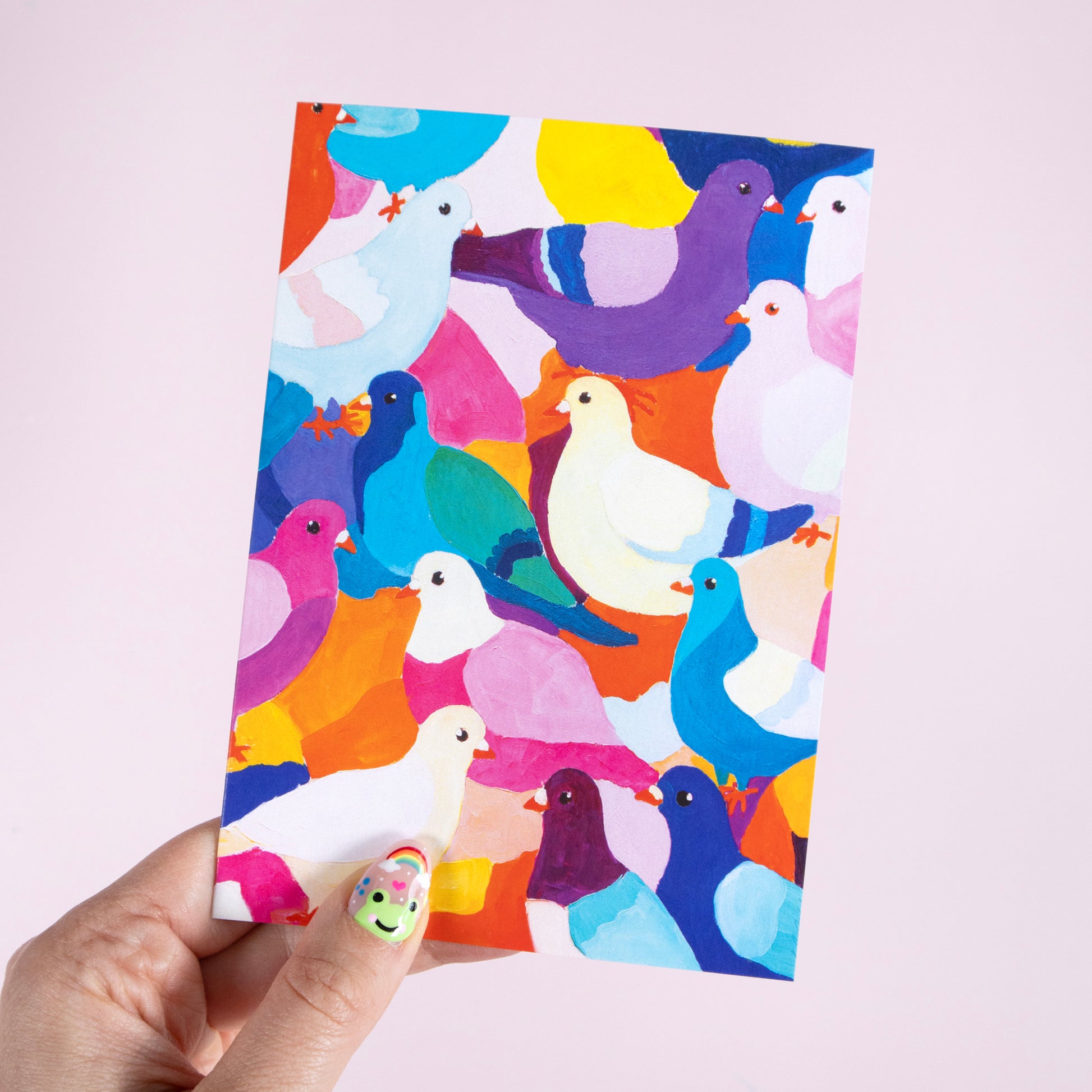 A card with my original oil pastel artwork of colourful, happy pigeons!! Perfect for any occasion needing a marvellous pop of colour and celebration - be it a birthday, thank you note, or just a way to say hello! The playful design makes it stand out and is sure to spark joy.