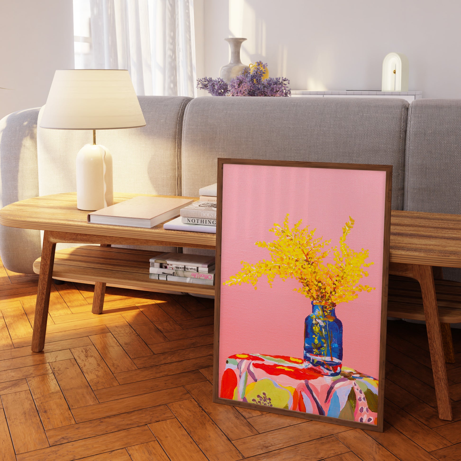 This colourful still life painting features Australia's national flower - the Golden Wattle. With fluffy little yellow flower heads, this plant represents unity and is a visual delight! This vibrant painting would add a great pop of colour and joy to any space. Original artwork done with acrylic paints.