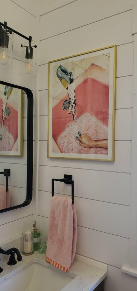 This feminine, pink bathroom print has different meanings depending on the viewer's perspective. Is it a relaxing scene in a retro 50's bath or does it contain underlying sexual symbolism? This is painted replica of an original photograph by Taylor Radelia.